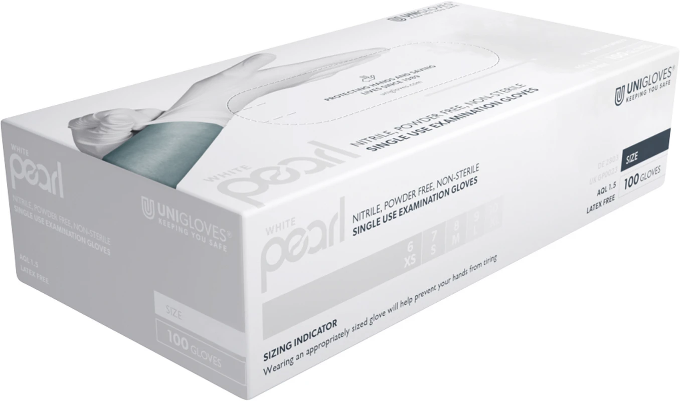 Starke Leistung mit stilvollem Auftritt: Die WHITE PEARL Nitrilhandschuhe aus der UNIGLOVES® PEARL LINE verbinden zuverlässigen Schutz mit hohem Tragekomfort und hervorragender Haptik. Die mikrogerauten Fingerspitzen sorgen für sicheres Greifen.
