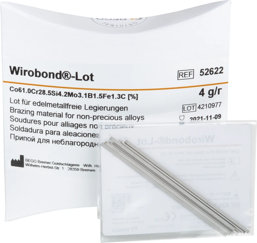Wirobond®, sehr gut geeignet für alle Wirobond®-Legierungen (Co-Cr-Aufbrennlegierungen), Solidus-, Liquidustemperatur 1.125, 1.195 °C. Empfohlenes Flussmittel ist Minoxyd.